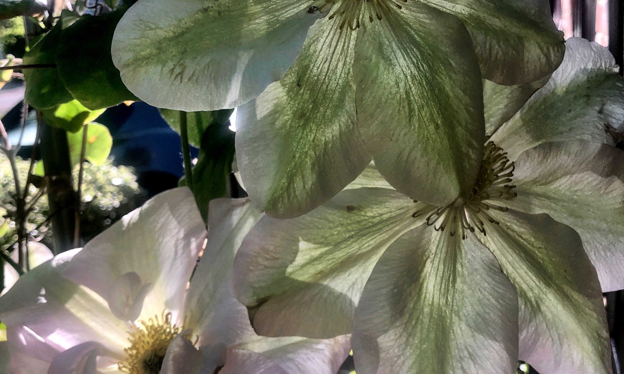 POTD Delicate Beautiful Clematis battered by the wind: with the sun behind the petals - do I detect a hint of mint?